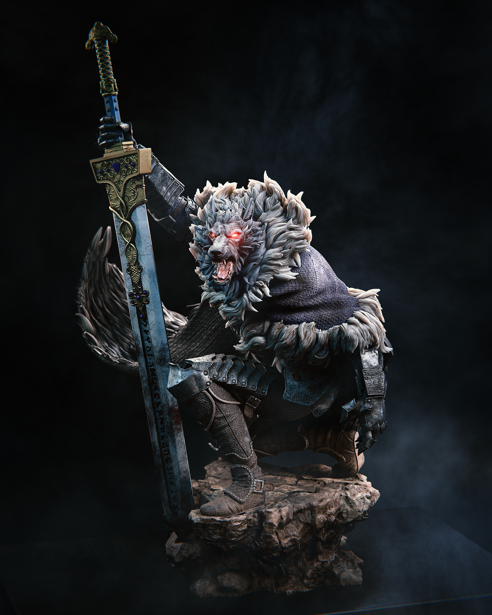 This piece captures the half-wolf warrior’s raw strength and solemn nobility—from the sculpted wolf helm and layered armor to the deep textures of his fur-lined cloak and massive blade. A true companion to Ranni the Witch, Blaidd stands as a symbol of devotion, power, and tragic fate.
